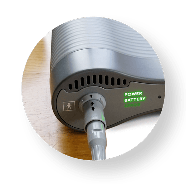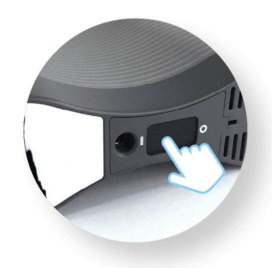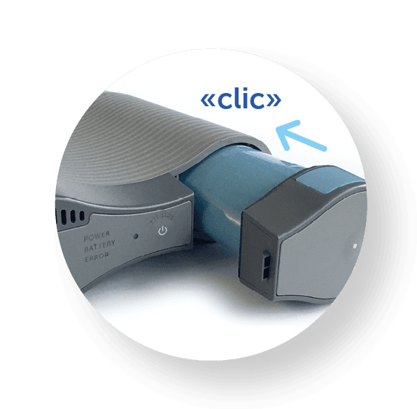 1. Insérer une batterie chargée dans le générateur jusqu’à entendre un « clic » tout en maintenant enfoncé les boutons bleus de chaque côté de la batterie. Alternative : brancher le dispositif sur le secteur grâce au câble d’alimentation (à connecter à l’arrière du dispositif.
